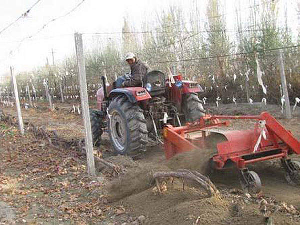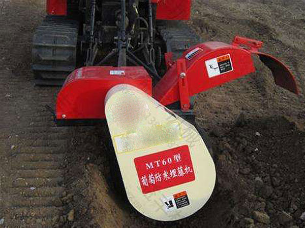 我公司研制的以使用廣泛的手扶拖拉機為動力的新型葡萄埋藤機,操作簡單,對各種地塊適應性強,工作效率高、埋土效果好、不傷根、不傷藤、堆土密、不漏風、比人工埋藤效果提高30倍以上,降低了勞動強度,節約勞動成本,符合現代農業發展方向。